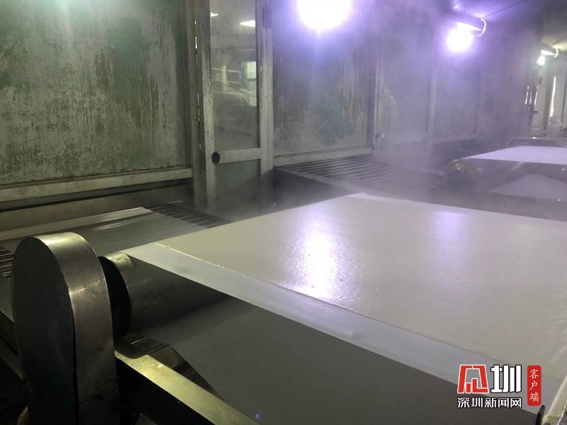 经过110摄氏度以上的高温蒸煮后,米浆变成熟化的米片,等待切条。