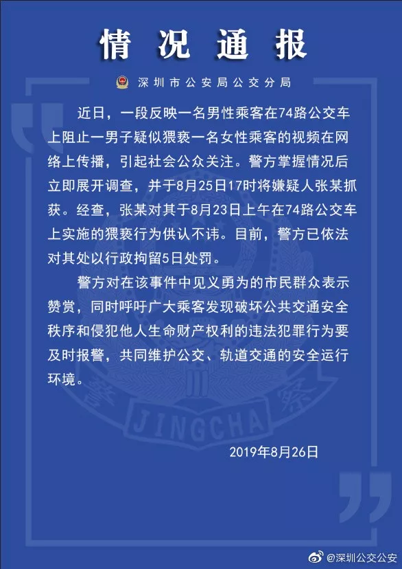 干得漂亮!看得人很解气!“咸猪手”性骚扰是违法的。昨天,深圳公安对此事进行了通报,该嫌疑人张某已被抓获,其对公交车上实施猥亵行为供认不讳,警方已依法对其处以行政拘留5天的处罚!