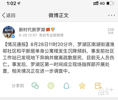 8月28日11时20分许,罗湖区南湖街道渔邨社区和平新居单身公寓楼发生沉降倾斜,事发前社区工作站已发现地下异响并撤离疏散居民,目前无人员伤亡。事发后,罗湖区第一时间成立现场指挥部开展处置,相关情况正在进一步调查中。