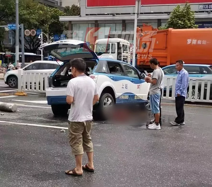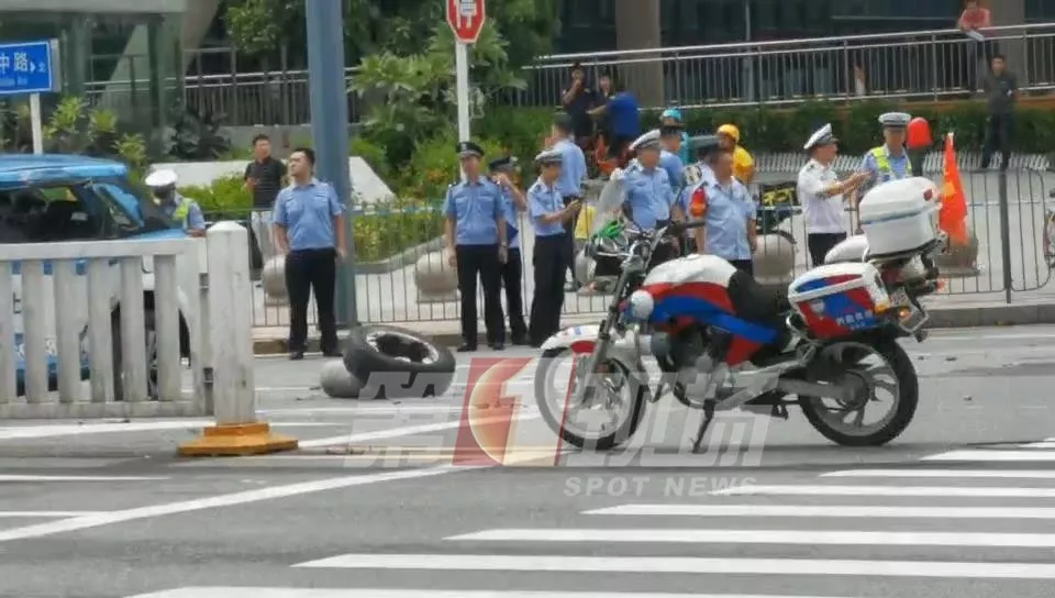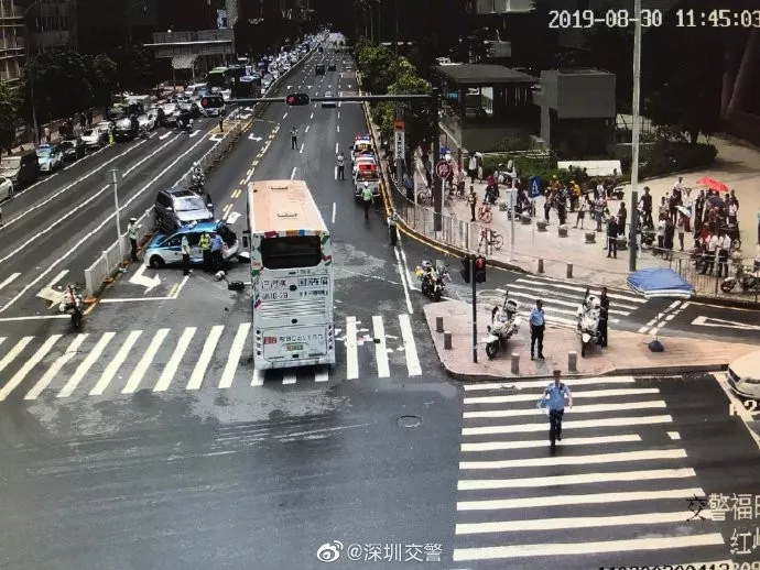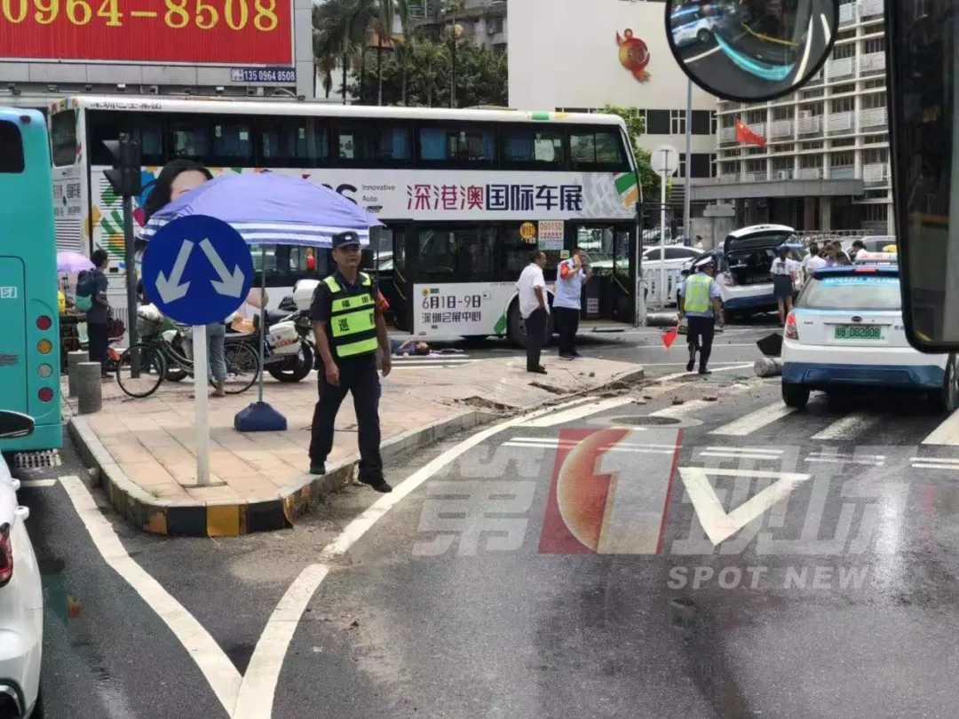 深广电第一现场2019年8月30日讯 今天上午11点15分,第一现场观众爆料称,在红岭地铁站附近一个十字路口发生了一起严重交通事故,一辆电动出租车与一辆双层大巴车及另一辆小车发生碰撞。