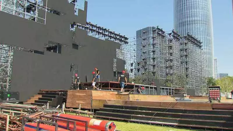 目前,文艺晚会的中心舞台和周围观众席已经基本成型,施工人员正在紧张工作当中。