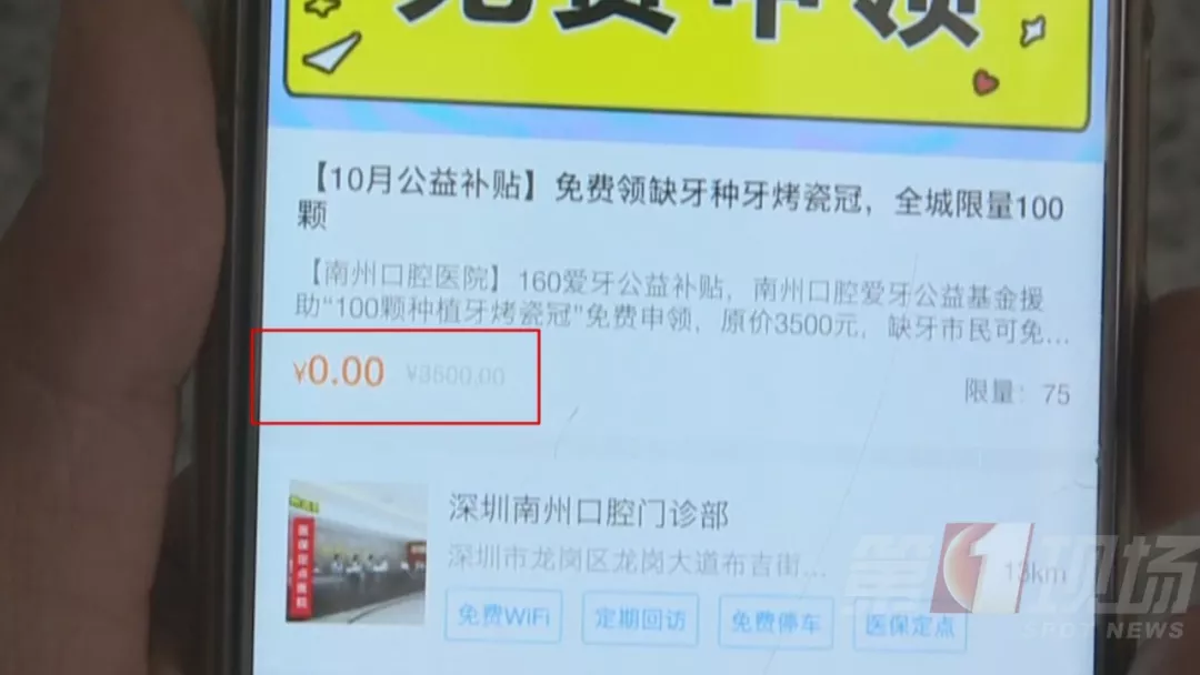 记者选择了0元申领种植牙烤瓷冠项目,活动界面显示原价为3500元,到了推记者出活动的南州口腔门诊部后,工作人员却告诉记者:“只有做了种植牙的项目才能免费牙冠。”