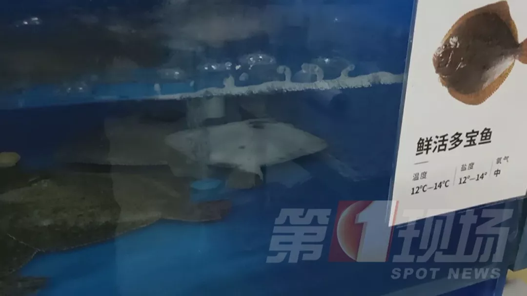 ▲水池内已经死亡的多宝鱼,令人讽刺的是,产品标签却标示着“鲜活多宝鱼”