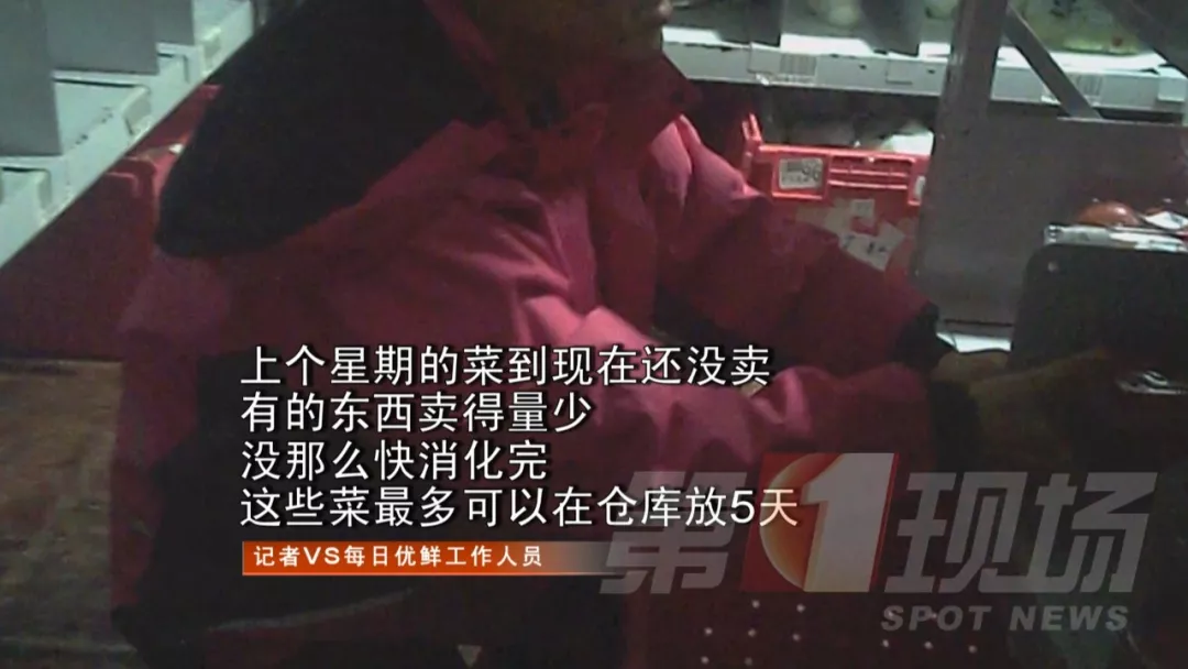 在暗访的过程中记者发现,叮咚买菜的货品,是每天晚上从总仓调拨到社区前置仓内。虽然标注着“新鲜蔬菜”,但到了配送时,都是先消化掉老批次的,新鲜蔬菜往后排期发货,因此消费者只能被动接受吃“旧菜”。