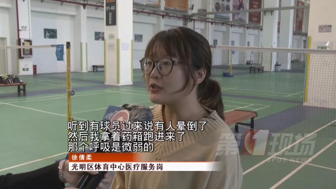 听到有人呼救后,光明区体育中心医疗服务岗的徐倩柔,拿着药箱第一时间赶到现场。当时羽毛球教练陈四龙正在帮吴先生进行心肺复苏,她检查后发现,患者的瞳孔放大,呼吸十分微弱,随时都有生命危险。