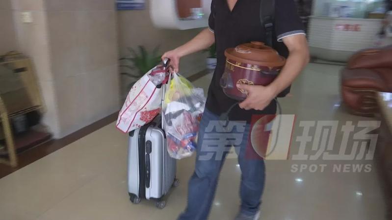 朱先生大包小包提着女友的行李,记者发现其中还有一个养生煲,朱先生说这是他刚刚从东莞特意带过来的。