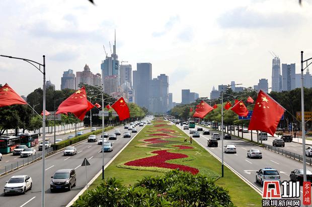 深南大道“凤凰飞羽”的花带和飘扬的五星红旗