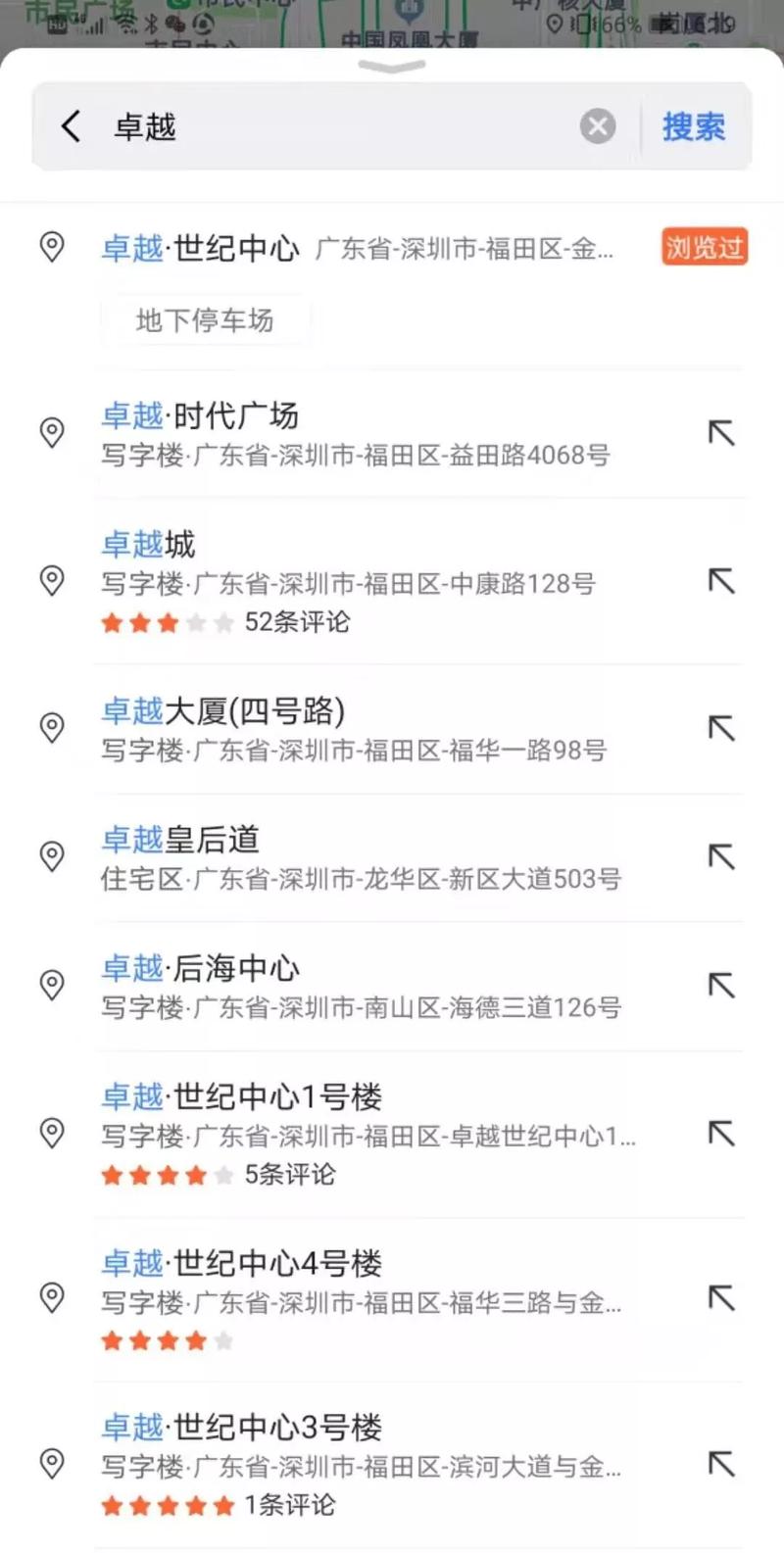 这还真不能怪司机大哥,因为记者打开地图,输入“卓越”两个字后居然有出现一大串不同的“卓越”地名!