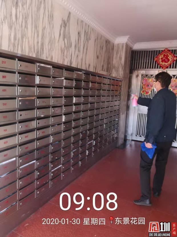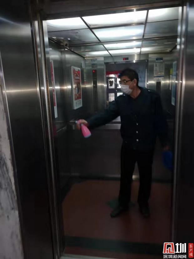 30日早上9:10分,记者在小区里正巧碰见了物业工作人员对大堂区域进行喷洒式消毒。物业管理处值班人员张先生告诉记者,从1月28日开始,小区每天会对大堂、电梯、每一层的楼道及其它公共区域进行2次全面消毒,用的是稀释过的含氯消毒水,对居民可能接触到的电梯按键及门把手,则使用未稀释过的消毒水全面擦拭,以求达到全面灭毒效果。