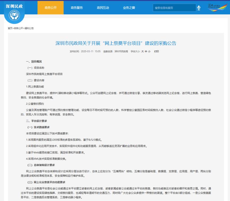 随着清明节日益临近,不少市民都想知道网上祭奠如何进行?记者查询深圳民政在线发现,3月11日,深圳市民政局发布了一条和“网上祭奠平台项目”建设相关的采购公告。公告对网上公众祭奠平台的建设要求包括:创建网上纪念馆、逝者信息展示、献花、上香、点烛、祭品、编写逝者生平事迹、祭奠留言、纪念相册等,并可通过微信祭扫小程序分享给亲友。